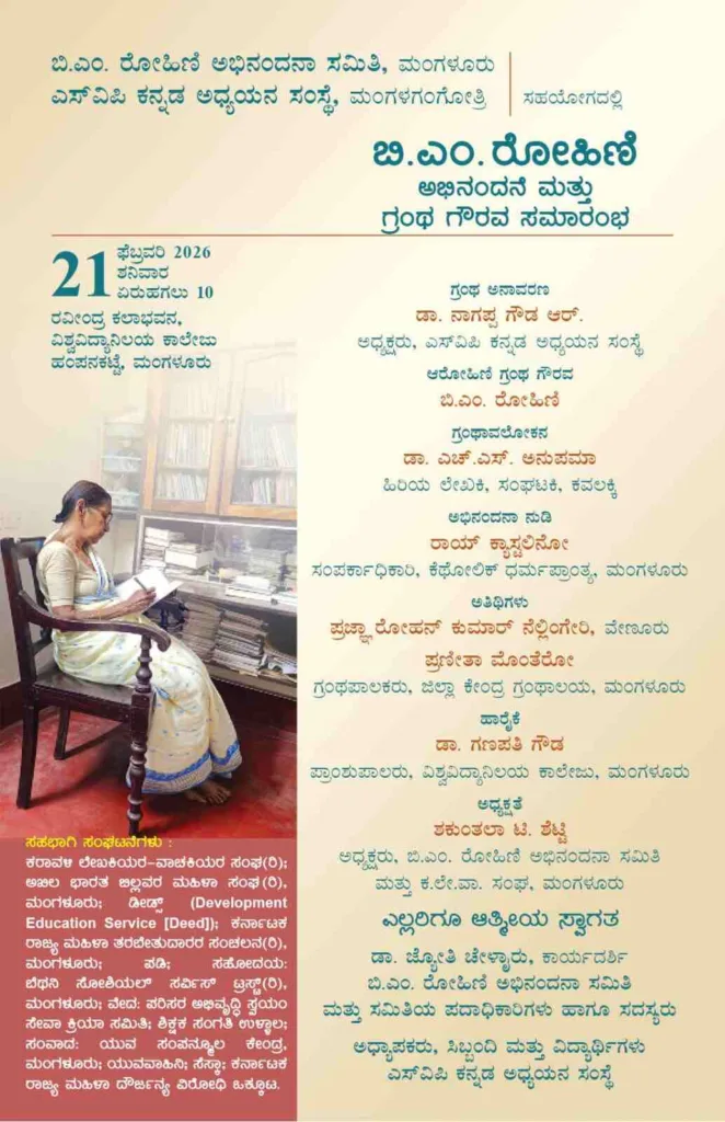 ಬಿ ಎಂ ರೋಹಿಣಿ ಅವರು ಏಪ್ರಿಲ್ 6, 2026 ಕ್ಕೆ 82 ತುಂಬಿ 83ಕ್ಕೆ ಕಾಲಿಡುತ್ತಿದ್ದಾರೆ. ಇಂತಹ ಸಂದರ್ಭದಲ್ಲಿ ಅವರಿಗೆ ಅವರ ಗೆಳತಿಯರು, ಅಭಿಮಾನಿಗಳು, ಕರಾವಳಿಯ ವಿದ್ವತ್ ವಲಯ, ಶಿಷ್ಯರು, ಸಹೋದ್ಯೋಗಿಗಳು, ಅವರು ಒಡನಾಡಿದ ಎಲ್ಲ ಸಂಘ ಸಂಸ್ಥೆಯವರು ಒಗ್ಗೂಡಿ ಅವರ ಮೇಲಿನ ತಮ್ಮ ಪ್ರೀತಿ, ಅಭಿಮಾನ, ಗೌರವಗಳ ಅಭಿವ್ಯಕ್ತಿಗಾಗಿ 21.02.2026 ಮಂಗಳೂರಿನಲ್ಲಿ ʼನಾಗರಿಕ ಸನ್ಮಾನʼ ಮಾಡುತ್ತಿದ್ದಾರೆ. ಅವರಿಗೆ ತುಂಬು ಮನದ ಶುಭಾಶಯಗಳು.