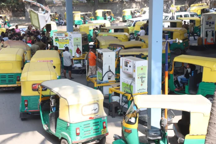 ಆಟೋ ಚಾಲಕರು ಬೆಳಗ್ಗೆ 4 ಗಂಟೆಯಿಂದಲೇ ಕ್ಯೂ ನಲ್ಲಿ ನಿಂತಿದ್ದಾರೆ. ಸುಮಾರು 2 ಕಿ.ಮೀ ದೂರಗಳಷ್ಟು ಆಟೋ ಸಾಲುಗಟ್ಟಿ ನಿಂತಿವೆ. ಆಟೋ ಚಾಲಕರು ಪರದಾಡುತ್ತಿದ್ದಾರೆ. ಗ್ಯಾಸ್ ಬೆಲೆ ಏರಿಕೆಯೂ ಆಗಿದೆ.