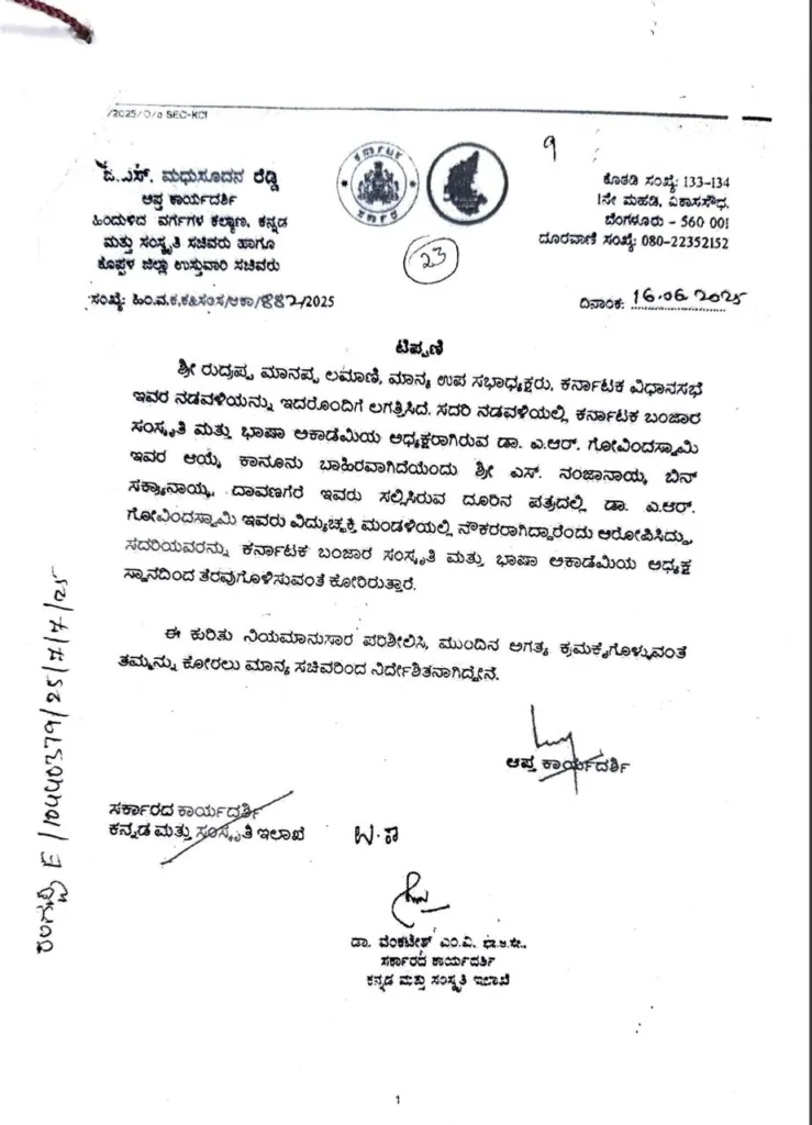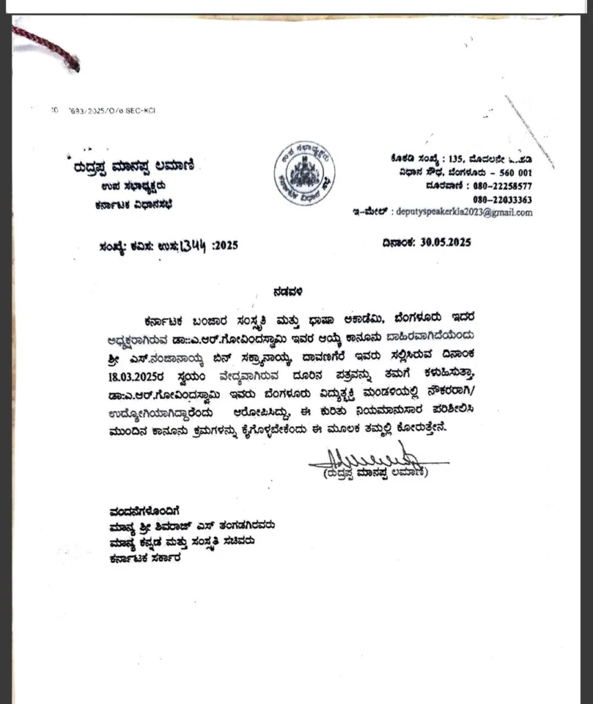ಈ ಪತ್ರದಿಂದ ಕೆರಳಿದ ಮಾನ್ಯ ರುದ್ರಪ್ಪ ಲಮಾಣಿಯವರು ತಮ್ಮ ಆದೇಶಪೂರ್ವಕ ಶಿಫಾರಸ್ಸನ್ನು ಕಡೆಗಣಿಸಿದ ಬಂಜಾರ ಅಕಾಡೆಮಿಯ ಅಧ್ಯಕ್ಷರನ್ನೇ ಪದಚ್ಯುತಗೊಳಿಸುವ ಪ್ರಯತ್ನ ಶುರುಮಾಡಿದರು. ಅಕಾಡೆಮಿ ನಿಯಮಾನುಸಾರ ತೆಗೆದುಕೊಂಡ ನಿರ್ಣಯವನ್ನು ಬದಲಾಯಿಸಲಾಗದು ಎಂಬ ಕನಿಷ್ಠ ಅರಿವಿಲ್ಲದ ರುದ್ರಪ್ಪನವರು ಪ್ರಶಸ್ತಿ ಪ್ರಕರಣವನ್ನು ಪ್ರತಿಷ್ಠೆಯಾಗಿ ತೆಗೆದುಕೊಂಡರು. ಅಕಾಡೆಮಿಯಲ್ಲಿ ಸದಸ್ಯರಾಗಿರುವ ತಮ್ಮ ಆಜ್ಞಾಧಾರಕ ಎಸ್. ನಂಜಾನಾಯ್ಕರವರಿಂದ 18-03-2025 ರಂದು ದೂರು ಪತ್ರವನ್ನು ಬರೆಯಿಸಿದರು. ಈ ದೂರಿನನ್ವಯ ಗೋವಿಂದಸ್ವಾಮಿಯವರ ಆಯ್ಕೆಯೇ ಕಾನೂನುಬಾಹಿರವೆಂದೂ, ಗೋವಿಂದಸ್ವಾಮಿಯವರು ಸರಕಾರಿ ಉದ್ಯೋಗಿಯಾಗಿದ್ದಾರೆಂದು ಆರೋಪಿಸಿ ತಮ್ಮದೇ ಲೆಟರ್ ಹೆಡ್ ನಲ್ಲಿ 30-05-2025 ರಂದು ನಡಾವಳಿ ಪತ್ರ ಬರೆದು ಸಂಸ್ಕೃತಿ ಇಲಾಖೆಯ ಸಚಿವರಾದ ಮಾನ್ಯ ಶಿವರಾಜ್ ತಂಗಡಗಿಯವರಿಗೆ ರವಾನಿಸಿದರು. ಕೊಪ್ಪಳ ಜಿಲ್ಲಾ ಉಸ್ತುವಾರಿ ಸಚಿವರಾದ ಮಧೂಸೂದನ ರೆಡ್ಡಿಯವರಿಂದಲೂ ಸಂಸ್ಕೃತಿ ಇಲಾಖೆಯ ಕಾರ್ಯದರ್ಶಿ ಗಳಿಗೆ ಟಿಪ್ಪಣಿ ಪತ್ರ ಬರೆಯಿಸಿದರು.