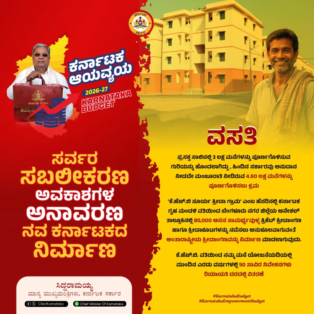 ಮುಂದಿನ ಎರಡು ವರ್ಷಗಳಲ್ಲಿ ಕರ್ನಾಟಕ ಗೃಹ ಮಂಡಳಿ ವತಿಯಿಂದ ‘ನಮ್ಮ ಮನೆ’ ಯೋಜನೆಯಡಿ 50 ಸಾವಿರ ನಿವೇಶನಗಳನ್ನು ರಿಯಾಯತಿ ದರದಲ್ಲಿ ವಿತರಿಸಲು ಉದ್ದೇಶಿಸಲಾಗಿದೆ. ಜೊತೆಗೆ, ಕೊಳಗೇರಿ ಅಭಿವೃದ್ಧಿ ಮಂಡಳಿಯಿಂದ ನಿರ್ಮಿಸಲಾಗುತ್ತಿರುವ 1.29 ಲಕ್ಷ ಮನೆಗಳಲ್ಲಿ ಈಗಾಗಲೇ 79,134 ಮನೆಗಳನ್ನು ಲೋಕಾರ್ಪಣೆ ಮಾಡುವ ಮೂಲಕ ಬಡವರಿಗೆ ಶಾಶ್ವತ ಸೂರು ನೀಡಲಾಗಿದೆ.