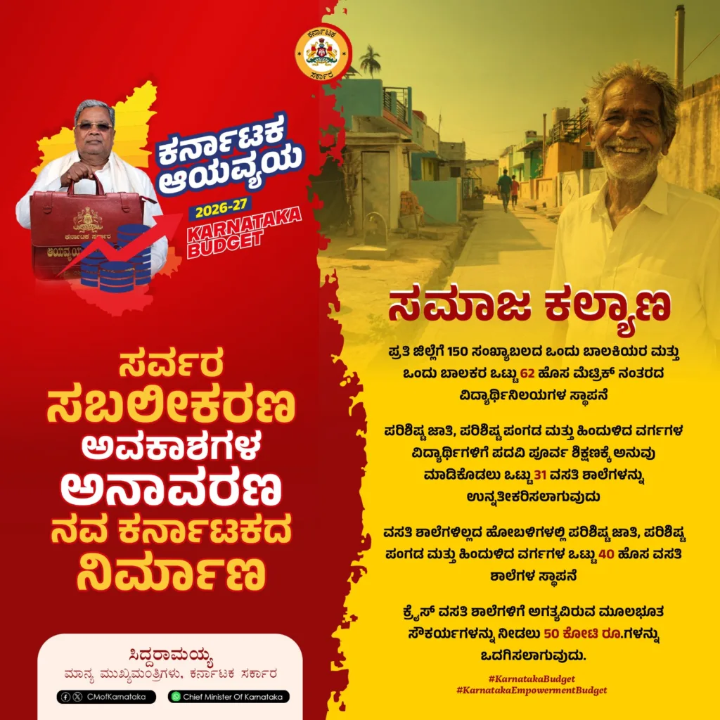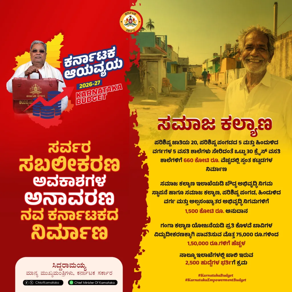 ರಾಜ್ಯ ಸರ್ಕಾರವು 2026-27ನೇ ಸಾಲಿನಲ್ಲಿ SCSP-TSP ಯೋಜನೆಯಡಿ ಒಟ್ಟು 44,632 ಕೋಟಿ ರೂ. ಅನುದಾನವನ್ನು ಒದಗಿಸಿದೆ. ಇದರಲ್ಲಿ ಪರಿಶಿಷ್ಟ ಜಾತಿ ಉಪಯೋಜನೆಗೆ 31,804 ಕೋಟಿ ರೂ. ಹಾಗೂ ಬುಡಕಟ್ಟು ಉಪಯೋಜನೆಗೆ 12,828 ಕೋಟಿ ರೂ.ಗಳನ್ನು ಮೀಸಲಿಡಲಾಗಿದೆ. ಶಿಕ್ಷಣಕ್ಕೆ ಹೆಚ್ಚಿನ ಒತ್ತು ನೀಡಲಾಗಿದ್ದು, ಕಳೆದ ಮೂರು ವರ್ಷಗಳಲ್ಲಿ 75 ಲಕ್ಷ ವಿದ್ಯಾರ್ಥಿಗಳಿಗೆ 2,676 ಕೋಟಿ ರೂ.ಗಳ ವಿದ್ಯಾರ್ಥಿವೇತನವನ್ನು ಯಶಸ್ವಿಯಾಗಿ ವಿತರಿಸಲಾಗಿದೆ.