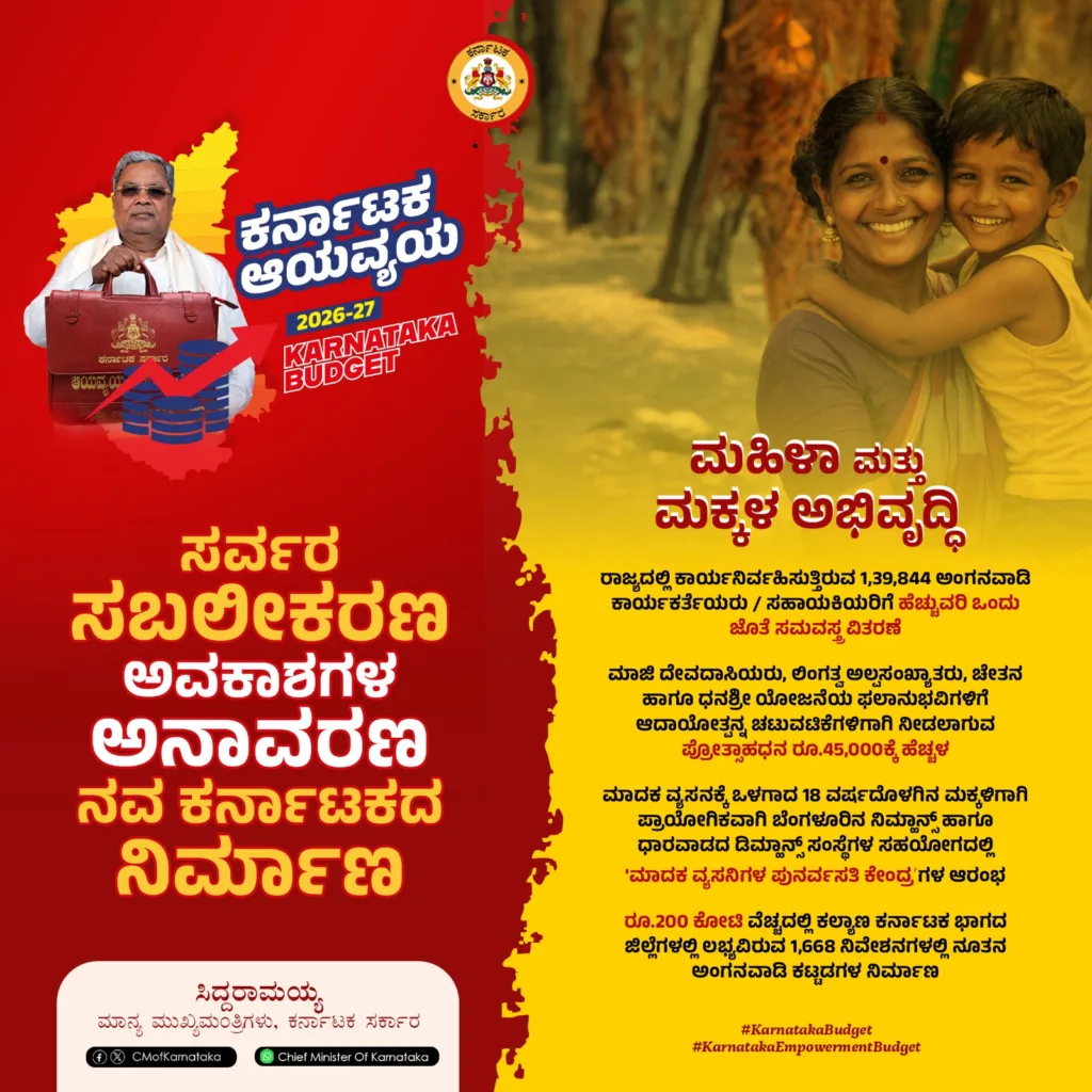 - ಕಲ್ಯಾಣ ಕರ್ನಾಟಕ ಪ್ರದೇಶದಲ್ಲಿ ಪ್ರಾಥಮಿಕ ಬಾಲ್ಯ ಆರೈಕೆ ಮತ್ತು ಶಿಕ್ಷಣವನ್ನು (ECCE) ಬಲಪಡಿಸಲು ಈ ಭಾಗದ ಜಿಲ್ಲೆಗಳಲ್ಲಿ ಲಭ್ಯವಿರುವ 1,668 ನಿವೇಶನಗಳಲ್ಲಿ ಅಂಗನವಾಡಿ ಕಟ್ಟಡಗಳ ನಿರ್ಮಾಣವನ್ನು 200 ಕೋಟಿ ರೂ.ಗಳ ವೆಚ್ಚದಲ್ಲಿ KKRDB ಅನುದಾನದಿಂದ ಕೈಗೊಳ್ಳಲಾಗುವುದು.