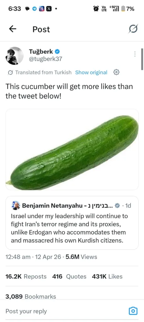 ಇತ್ತೀಚೆಗೆ ಟರ್ಕಿಶ್‌ ಅಧ್ಯಕ್ಷರಿಗೆ ನೆತನ್ಯಾಹು ನೀಡಿದ ಹೇಳಿಕೆ ಕುರಿತು ಸಾಮಾಜಿಕ ಜಾಲತಾಣದಲ್ಲಿ ಸೌತೆಕಾಯಿ ಫೋಟೋ ಒಂದು ವೈರಲ್‌ ಆಗುತ್ತಿದೆ. ನೆತನ್ಯಾಹು ಮಾಡಿದ್ದ ಟ್ವೀಟ್‌ಗೆ ಪ್ರತಿಯಾಗಿ ಟಗ್‌ಬರ್ಕ್‌ ಎಂಬುವರ ಟ್ವೀಟ್‌ ಭಾರಿ ಸುದ್ದು ಮಾಡಿದೆ.