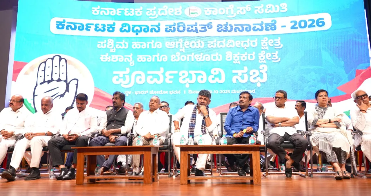 ಬೆಂಗಳೂರು: ನಗರದ ಕೆಪಿಸಿಸಿ ಕಚೇರಿಯ ಭಾರತ್ ಜೋಡೋ ಸಭಾಂಗಣದಲ್ಲಿ ಕೆಪಿಸಿಸಿ ಅಧ್ಯಕ್ಷ ಹಾಗೂ ಉಪ ಮುಖ್ಯಮಂತ್ರಿ ಡಿ.ಕೆ. ಶಿವಕುಮಾರ್ ಅವರ ನೇತೃತ್ವದಲ್ಲಿ 2026ರ ಪಶ್ಚಿಮ, ಆಗ್ನೇಯ ಪದವೀಧರ ಕ್ಷೇತ್ರ ಹಾಗೂ ಈಶಾನ್ಯ, ಬೆಂಗಳೂರು ಶಿಕ್ಷಕರ ಕ್ಷೇತ್ರದ ವಿಧಾನ ಪರಿಷತ್ ಚುನಾವಣೆಯ ಪೂರ್ವಭಾವಿ ಸಿದ್ಧತೆ ಸಭೆ ನಡೆಯಿತು. ಸಭೆಯಲ್ಲಿ ಪಕ್ಷದ ಕಾರ್ಯತಂತ್ರಗಳನ್ನು ಕುರಿತು ಚರ್ಚೆ ನಡೆಯಿತು.