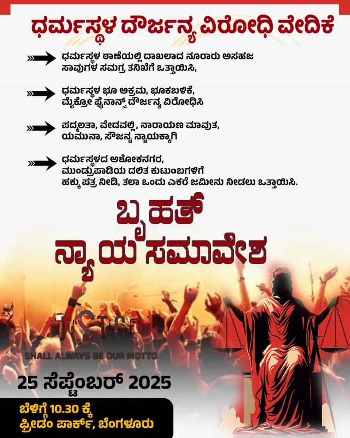 ಹಾಗಾಗಿ, ಧರ್ಮಸ್ಥಳ ಠಾಣೆಯಲ್ಲಿ ದಾಖಲಾದ ನೂರಾರು ಅತ್ಯಾಚಾರ, ಅಸಹಜ ಸಾವು, ಕೊಲೆ ಪ್ರಕರಣಗಳನ್ನು ಎಸ್ಐಟಿ ರಚನೆಯ ಸಂಬಂಧ ಹೊರಡಿಸಲಾದ ಆದೇಶದಲ್ಲಿ ಇರುವಂತೆಯೇ ಪರಿಪೂರ್ಣವಾದ ತನಿಖೆಗೆ ಒಳಪಡಿಸಬೇಕು. ಪದ್ಮಲತಾ, ವೇದದಲ್ಲಿ, ಮಾವುತ ನಾರಾಯಣ, ಯಮುನ, ಸೌಜನ್ಯ ಕೊಲೆ ಪ್ರಕರಣಗಳು, ಭೂಕಬಳಿಕೆ, ಮೈಕ್ರೊ ಫೈನಾನ್ಸ್ ದೌರ್ಜನ್ಯಗಳು, ದಲಿತರ ಮೀಸಲು ಭೂಮಿ ಕಬಳಿಕೆ, ಆರ್ಥಿಕ ಅಪರಾಧದ ಆರೋಪದ ಪ್ರಕರಣಗಳನ್ನು ಈಗ ರಚಿಸಲಾಗಿರುವ SIT ಗೆ ವಹಿಸಲು ಸಮಸ್ಯೆಗಳಿದ್ದಲ್ಲಿ ಪ್ರತ್ಯೇಕವಾದ ವಿಶೇಷ ತನಿಖಾ ತಂಡವನ್ನು ರಚಿಸಿ ತನಿಖೆಗೆ ಒಳಪಡಿಸಬೇಕು ಎಂದು ಆಗ್ರಹಿಸಲು ‘ನ್ಯಾಯ ಸಮಾವೇಶ’ ನಡೆಯುತ್ತಿದೆ ಎಂದು ಧರ್ಮಸ್ಥಳ ದೌರ್ಜನ್ಯ ವಿರೋಧಿ ವೇದಿಕೆ ಆಗ್ರಹಪಡಿಸಿದೆ.