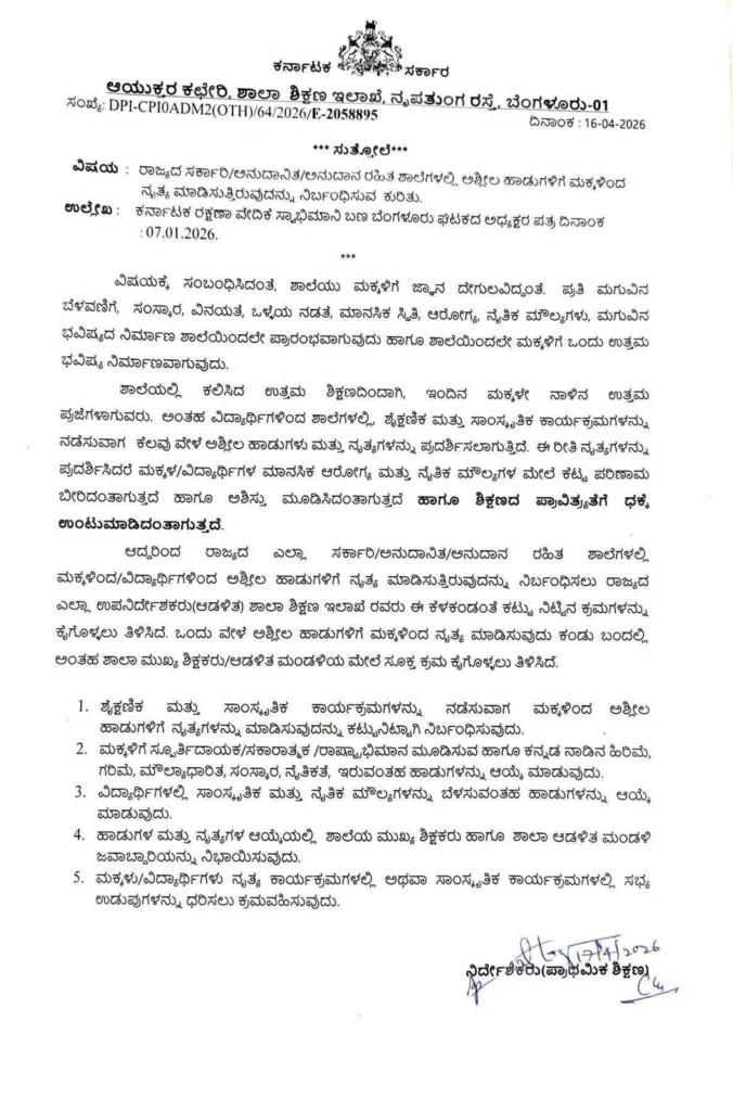 ರಾಜ್ಯದ ಎಲ್ಲ ಸರ್ಕಾರಿ, ಅನುದಾನಿತ ಮತ್ತು ಅನುದಾನ ರಹಿತ ಶಾಲೆಗಳಲ್ಲಿ ಮಕ್ಕಳು ಅಶ್ಲೀಲ ಮತ್ತು ಅಸಭ್ಯ ಹಾಡುಗಳಿಗೆ ನೃತ್ಯ ಮಾಡಿಸುವುದನ್ನು ನಿಷೇಧಿಸಿ ಪ್ರಾಥಮಿಕ ಶಾಲಾ ಶಿಕ್ಷಣ ನಿರ್ದೇಶಕರು ಆದೇಶ ಹೊರಡಿಸಿದ್ದಾರೆ.