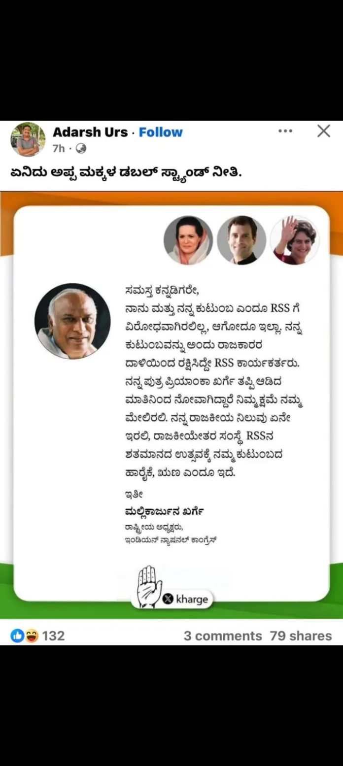 ಇದೀಗ ಎಐಸಿಸಿ ಅಧ್ಯಕ್ಷ, ರಾಜ್ಯಸಭೆ ವಿಪಕ್ಷ ನಾಯಕ ಮಲ್ಲಿಕಾರ್ಜುನ ಖರ್ಗೆ ಅವರ ಹೆಸರಿನಲ್ಲಿ ಪೋಸ್ಟರ್‌ ವೊಂದು ಸಾಮಾಜಿಕ ಜಾಲತಾಣಗಳಲ್ಲಿ ಹರಿದಾಡುತ್ತಿದೆ. ಈ ಪೋಸ್ಟರ್‌ ಅನ್ನು ಸ್ವತಃ ಮಲ್ಲಿಕಾರ್ಜುನ ಖರ್ಗೆ ಅವರೇ RSS ಕ್ಷಮೆ ಕೇಳಿದಂತೆ ಸೃಷ್ಟಿಸಲಾಗಿದೆ. ಅಂದು ರಾಜಕಾರರಿಂದ ನಮ್ಮ ಕುಟುಂಬವನ್ನು ರಕ್ಷಿಸಿದ್ದೇ ಸಂಘ ಪರಿವಾರ. ಅದರ ಋಣ ನಮ್ಮ ಮೇಲಿದೆ ಎಂದು ಹೇಳಲಾಗಿದೆ.