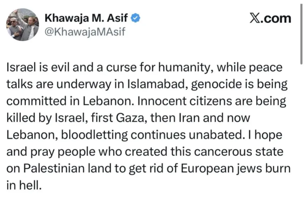 ಆಸಿಫ್ ಅವರು ಎಕ್ಸ್ (X) “ಇಸ್ರೇಲ್ ಒಂದು ಕೆಟ್ಟ ಶಕ್ತಿ ಮತ್ತು ಮಾನವಕುಲಕ್ಕೆ ಶಾಪವಾಗಿದೆ. ಇಸ್ಲಾಮಾಬಾದ್ನಲ್ಲಿ ಶಾಂತಿ ಮಾತುಕತೆಗಳು ನಡೆಯುತ್ತಿರುವಾಗಲೇ ಲೆಬನಾನ್ನಲ್ಲಿ ನರಮೇಧ ನಡೆಸಲಾಗುತ್ತಿದೆ. ಇಸ್ರೇಲ್ನಿಂದ ಅಮಾಯಕ ನಾಗರಿಕರನ್ನು ಕೊಲ್ಲಲಾಗುತ್ತಿದೆ; ಮೊದಲು ಗಾಜಾ, ನಂತರ ಇರಾನ್ ಮತ್ತು ಈಗ ಲೆಬನಾನ್ನಲ್ಲಿ ರಕ್ತಪಾತವು ಅವಿರತವಾಗಿ ಮುಂದುವರಿಯುತ್ತಿದೆ. ಯುರೋಪಿಯನ್ ಯಹೂದಿಗಳಿಂದ ಮುಕ್ತಿ ಪಡೆಯಲು ಪ್ಯಾಲೇಸ್ಟಿನಿಯನ್ ಭೂಮಿಯಲ್ಲಿ ಈ ಕ್ಯಾನ್ಸರ್ ತರಹದ ರಾಷ್ಟ್ರವನ್ನು ಸೃಷ್ಟಿಸಿದ ಜನರು ನರಕದಲ್ಲಿ ಉರಿಯಲಿ ಎಂದು ನಾನು ಆಶಿಸುತ್ತೇನೆ ಮತ್ತು ಪ್ರಾರ್ಥಿಸುತ್ತೇನೆ.”ಎಂದು ಬರೆದುಕೊಂಡಿದ್ದಾರೆ.