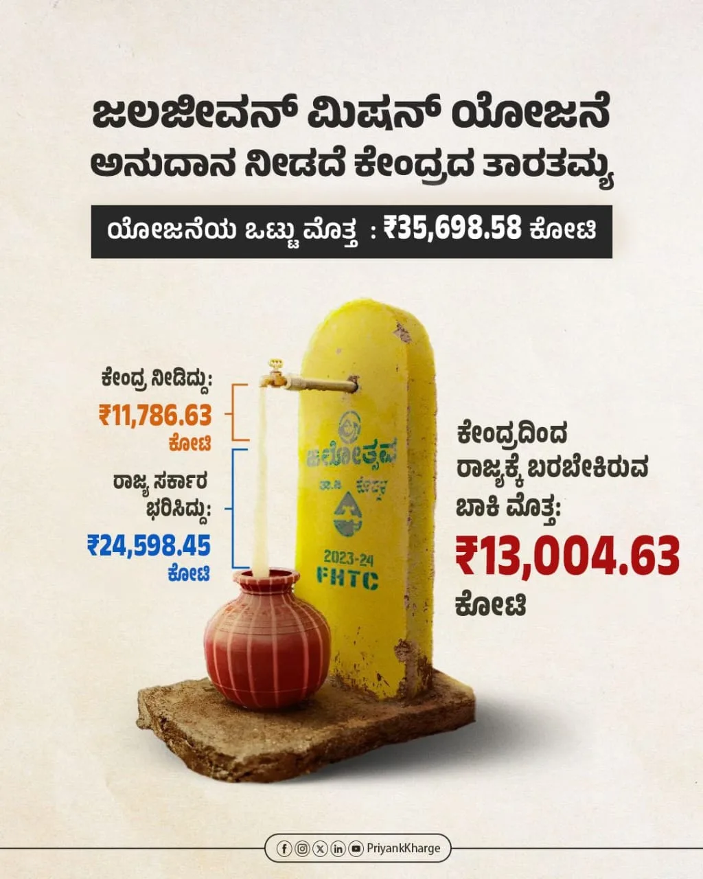 ಸಾಮಾಜಿಕ ಜಾಲತಾಣ ಎಕ್ಸ್‌ ನಲ್ಲಿ ಅವರು JJM ಯೋಜನೆಗಾಗಿ ರಾಜ್ಯ ಸರ್ಕಾರ ಖರ್ಚು ಮಾಡಿದ್ದೆಷ್ಟು ಮತ್ತು ಕೇಂದ್ರ ಸರ್ಕಾರ ನೀಡಿದ್ದೆಷ್ಟು ಎಂದು ಅಂಕಿಅಂಶ ಒದಗಿಸಿದ್ದಾರೆ. ಆ ಮೂಲಕ ಕೇಂದ್ರ ಸ್ಕಾರದ ನಿರ್ಲಕ್ಷ್ಯವನ್ನು ಬಯಲಿಗೆಳೆದಿದ್ದಾರೆ.