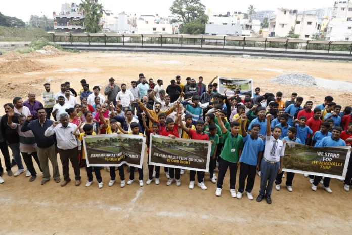 ಬೆಂಗಳೂರು: ಸರ್ವಜ್ಞ ನಗರದ ಜೀವನಹಳ್ಳಿಯಲ್ಲಿ ಫುಟ್ಬಾಲ್ ಟರ್ಫ್ ನಿರ್ಮಾಣಕ್ಕೆ ಕೇಳಿ ಬಂದಿರುವ ವಿರೋಧಕ್ಕೆ ಬಗ್ಗದೇ, ಕ್ರೀಡಾಂಗಣ ನಿರ್ಮಾಣ ಆಗಬೇಕೆಂದು ಆಗ್ರಹಿಸಿ ಸ್ಥಳೀಯರು ಕ್ರೀಡಾಂಗಣದ ಬಳಿ ಇಂದು ಪ್ರತಿಭಟನೆ ನಡೆಸಿದರು.