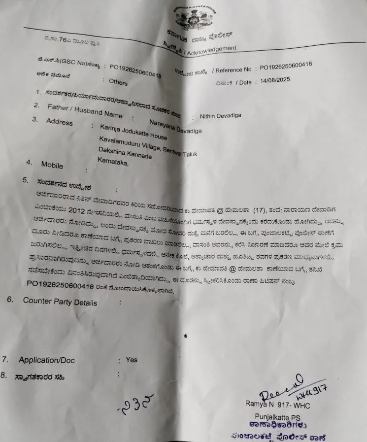 ಎಸ್ ಐಟಿ ನೀಡಿರುವ ಸೀಕೃತಿ ಪತ್ರವನ್ನು ತೋರಿಸಿದಾಗ ಪುಂಜಾಲಕಟ್ಟೆ ಪೊಲೀಸರು ಅಂತಿಮವಾಗಿ 2025 ರ ಆಗಸ್ಟ್ 14 ರಂದು ದೂರು ದಾಖಲಿಸಿಕೊಂಡು ತನಿಖೆ ಆರಂಭಿಸಿದ್ದಾರೆ. ಹೇಮಲತಾ ಅವರ ಮಾಹಿತಿ ಸಂಗ್ರಹಿಸಲು ಸ್ಥಳೀಯ ಪೊಲೀಸರು ಮೂರು ಬಾರಿ ದೇವಾಡಿಗ ಅವರ ಮನೆಗೆ ಭೇಟಿ ನೀಡಿದ್ದಾರೆ. ಪೊಲೀಸರು ವಾಸಂತಿ ಅವರ ಮನೆಗೂ ಭೇಟಿ ನೀಡಿದ್ದಾರೆ. ಮತ್ತೊಮ್ಮೆ ನಮ್ಮ ಮನೆಗೆ ಭೇಟಿ ನೀಡಿದರೆ ಆತ್ಮಹತ್ಯೆ ಮಾಡಿಕೊಳ್ಳುವುದಾಗಿ ವಾಸಂತಿ ಬೆದರಿಕೆ ಹಾಕಿದ್ದಾರೆ ಎಂದು ಪೊಲೀಸ್ ಮೂಲಗಳು ಖಚಿತಪಡಿಸಿವೆ.