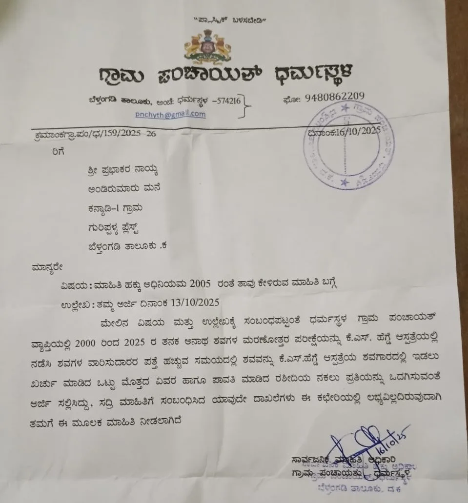 ಬೆಳ್ತಂಗಡಿ ತಾಲೂಕಿನ ಕನ್ಯಾಡಿ ಗ್ರಾಮದ ಪ್ರಭಾಕರ ನಾಯ್ಕ ಎಂಬುವರು ಆರ್ ಟಿಐ ಅಡಿಯಲ್ಲಿ ಈ ಮಾಹಿತಿ ಕೇಳಿದ್ದರು. ಧರ್ಮಸ್ಥಳ ಗ್ರಾಮ ಪಂಚಾಯತ್ ವ್ಯಾಪ್ತಿಯಲ್ಲಿ 2000 ರಿಂದ 2025 ರವರೆಗೆ ಅನಾಥ ಶವಗಳ ಮರಣೋತ್ತರ ಪರೀಕ್ಷೆಯನ್ನು ಕೆ.ಎಸ್. ಹೆಗ್ಡೆ ಆಸ್ಪತ್ರೆಯಲ್ಲಿ ನಡೆಸಿ ಶವಗಳ ವಾರಸುದಾರರ ಪತ್ತೆ ಹಚ್ಚುವ ಸಮಯದಲ್ಲಿ ಶವಗಳನ್ನು ಕೆ.ಎಸ್.ಹೆಗ್ಡೆ ಆಸ್ಪತ್ರೆಯ ಶೈತ್ಯಾಗಾರದಲ್ಲಿ ಇಡಲು ಖರ್ಚು ಮಾಡಿದ ಒಟ್ಟು ಮೊತ್ತದ ವಿವರ ಹಾಗೂ ಪಾವತಿ ಮಾಡಿದ ರಶೀದಿಯ ನಕಲು ಪ್ರತಿಯನ್ನು ಒದಗಿಸುವಂತೆ ಅರ್ಜಿ ಸಲ್ಲಿಸಿದ್ದರು. ಸದರಿ ಮಾಹಿತಿಗೆ ಸಂಬಂಧಿಸಿದ ಯಾವುದೇ ದಾಖಲೆಗಳು ಈ ಕಛೇರಿಯಲ್ಲಿ ಲಭ್ಯವಿಲ್ಲ ಎಂದು ಗ್ರಾಮ ಪಂಚಾಯಿತಿ ಅಧಿಕಾರಿ ಈ ಮಾಹಿತಿ ನೀಡಿದ್ದಾರೆ.