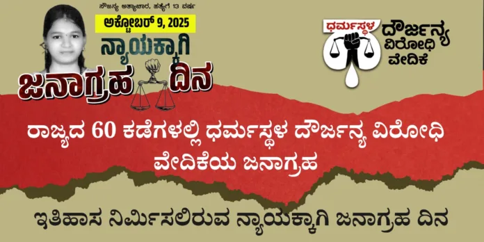 ಬೆಂಗಳೂರು : ಧರ್ಮಸ್ಥಳ ಸೌಜನ್ಯ ಅತ್ಯಾಚಾರ-ಕೊಲೆಯಾಗಿ 13 ವರ್ಷ ಸಂದಿರುವ ಹಿನ್ನಲೆಯಲ್ಲಿ ಧರ್ಮಸ್ಥಳದ ಅತ್ಯಾಚಾರ, ಕೊಲೆ, ಭೂಕಬಳಿಕೆ, ದಲಿತರ ಮೀಸಲು ಭೂಮಿ ಕಬಳಿಕೆ, ಮೈಕ್ರೋ ಫೈನಾನ್ಸ್ ಬಡ್ಡಿ ದಂಧೆಯನ್ನು ವಿರೋಧಿಸಿ  ಧರ್ಮಸ್ಥಳ ದೌರ್ಜನ್ಯ ವಿರೋಧಿ ವೇದಿಕೆಯು ಅಕ್ಟೋಬರ್ 09, 2025 ರಂದು ನ್ಯಾಯಕ್ಕಾಗಿ ಜನಾಗ್ರಹ ದಿನ ಆಯೋಜಿಸಿದೆ. ರಾಜ್ಯದ ಉದ್ದಗಲಗಳಲ್ಲಿ ಒಂದೇ ದಿನ 60 ಕಡೆಗಳಲ್ಲಿ ಜನಾಗ್ರಹ ಸಭೆ, ಆಗ್ರಹ ಪತ್ರ ಸಲ್ಲಿಕೆ,  ಸಮಾವೇಶ, ಪ್ರತಿಭಟನೆ, ಭಿತ್ತಿಪತ್ರ ಪ್ರದರ್ಶನ, ಕ್ಯಾಂಡಲ್ ಲೈಟ್ ಪ್ರದರ್ಶನಗಳು ನಡೆಯಲಿವೆ.