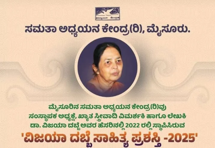 ಮೈಸೂರು : ಮೈಸೂರಿನ ಸಮತಾ ಅಧ್ಯಯನ ಕೇಂದ್ರ(ರಿ)ವು ಸಂಸ್ಥಾಪಕ ಅಧ್ಯಕ್ಷೆ, ಖ್ಯಾತ ಸ್ತ್ರೀವಾದಿ ವಿಮರ್ಶಕಿ ಹಾಗೂ ಲೇಖಕಿ ಡಾ. ವಿಜಯಾ ದಬ್ಬೆ ಅವರ ಹೆಸರಿನಲ್ಲಿ 2022 ರಲ್ಲಿ ಸ್ಥಾಪಿಸಿರುವ ‘ವಿಜಯಾ ದಬ್ಬೆ ಸಾಹಿತ್ಯ ಪ್ರಶಸ್ತಿ’ ಗೆ ಲೇಖಕಿಯರಿಂದ ಕಥಾ ಸಂಕಲನಗಳನ್ನು ಆಹ್ವಾನಿಸಿದೆ. 2022 ರಿಂದ 2025 ರ ಅವಧಿಯಲ್ಲಿ ಪ್ರಥಮ ಮುದ್ರಣ ಕಂಡ ಕಥಾ ಸಂಕಲನಗಳನ್ನು ಮಾತ್ರ ಪರಿಗಣಿಸಲಾಗುವುದು. ಪ್ರಶಸ್ತಿ 25,000 ರೂ. ನಗದು, ಫಲಕವನ್ನು ಒಳಗೊಂಡಿದ್ದು, ಜೂ.1 ರಂದು ಮೈಸೂರಿನಲ್ಲಿ ನಡೆಯುವ ಕಾರ್ಯಕ್ರಮದಲ್ಲಿ ಪ್ರದಾನ ಮಾಡಲಾಗುವುದು ಎಂದು ಸಮತಾ ಅಧ್ಯಯನ ಕೇಂದ್ರದ ಅಧ್ಯಕ್ಷರಾದ ಸಬಿಹಾ ಭೂಮಿಗೌಡ ಪ್ರಕಟಣೆಯಲ್ಲಿ ತಿಳಿಸಿದ್ದಾರೆ.