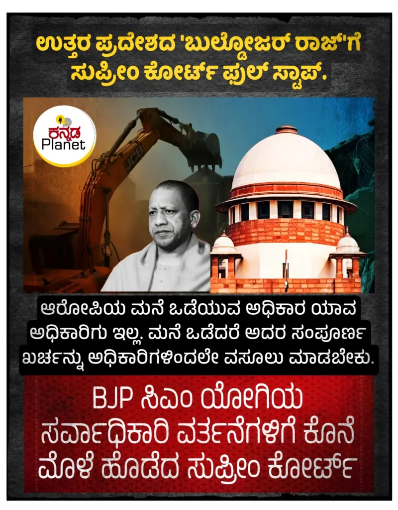 ಕಾನೂನು ಬಿಜೆಪಿ ಸಿಎಂ ಯೋಗಿಯ ಸರ್ವಾಧಿಕಾರಿ ವರ್ತನೆಗಳಿಗೆ ಕೊನೆ ಮೊಳೆ ಹೊಡೆದ ಸುಪ್ರೀಂ ಕೋರ್ಟ್ By ಕನ್ನಡ ಪ್ಲಾನೆಟ್ November 13, 2024 Share WhatsAppFacebookXCopy URL Tagsbulldozer injusticeSupream Courtuttar pradeshYogi Adityanath Share WhatsAppFacebookXCopy URL Previous articleಉಪ ಚುನಾವಣೆ: 11 ಗಂಟೆಯವರೆಗೆ ಚನ್ನಪಟ್ಟಣದಲ್ಲಿ ಶೇ.27.02, ಶಿಗ್ಗಾಂವಿಯಲ್ಲಿ ಶೇ.26.01 ರಷ್ಟು ಮತದಾನNext articleಸಲ್ಮಾನ್ ಖಾನ್ಗೆ ಜೀವ ಬೆದರಿಕೆ : ರಾಯಚೂರಿನಲ್ಲಿ ಯುವಕ ಬಂಧನ More articles ಬಟ್ಟೆ ಖರೀದಿಯಲ್ಲಿ ಅಕ್ರಮ ಆರೋಪ : ಹೈಕೋರ್ಟ್ ಆದೇಶಕ್ಕೆ ಸುಪ್ರೀಂ ತಡೆ April 13, 2026 ಅಮಿತ್ ಶಾ ಒಬ್ಬ ಗೂಂಡಾ? ಮತಾಂಧರಿಂದ ಹತ್ಯೆಯಾದ ಹರೇನ್ ಪಾಂಡ್ಯಾ! April 10, 2026 “ಕುಂಕುಮ ಸ್ವಾಮಿ ಕನ್ನೇರಿ ಬಾಯ್ಬಿಟ್ಟರೆ ಕಚಡಾ ಮೋರಿ” April 2, 2026 Share WhatsAppFacebookXCopy URL Latest article ಸ್ಮರಣೆ | ಆಚರಣೆಯಲ್ಲಿ ಅಲ್ಲ… ವಿಚಾರಗಳಲ್ಲಿ ಅಂಬೇಡ್ಕರ್ April 13, 2026 ಬಟ್ಟೆ ಖರೀದಿಯಲ್ಲಿ ಅಕ್ರಮ ಆರೋಪ : ಹೈಕೋರ್ಟ್ ಆದೇಶಕ್ಕೆ ಸುಪ್ರೀಂ ತಡೆ April 13, 2026 ಇಸ್ರೇಲ್ ಪ್ರಧಾನಿ ನೇತನ್ಯಾಹೂಗಿಂತ ಸೌತೆಕಾಯಿಗೆ ಹೆಚ್ಚು ಮೆಚ್ಚುಗೆ!- X ನಲ್ಲಿ ನಡೆದ ತಮಾಷೆ ಏನು? April 13, 2026 ಅರಣ್ಯದಲ್ಲಿ ʼಶರಣ್ಯʼ – ಬೇಕು ತಾರ್ಕಿಕ ಅಂತ್ಯ April 13, 2026 ಮತ್ತೆ ಆಟದಲ್ಲಿ ಲಯಕ್ಕೆ ಬರುವ ಬಗ್ಗೆ ತಂಡಕ್ಕೆ 2 ಸೂಚನೆ ಕೊಟ್ರಾ ಈ ತಂಡದ ನಾಯಕ? April 13, 2026 Most read ಕದನ ವಿರಾಮ : ತೈಲ ಬೆಲೆ ಕುಸಿತ, ಷೇರು ಮಾರುಕಟ್ಟೆಯಲ್ಲಿ ಭಾರೀ ಏರಿಕೆ April 8, 2026 ನಾಳೆ ದ್ವಿತೀಯ ಪಿಯುಸಿ ಫಲಿತಾಂಶ ಪ್ರಕಟ April 8, 2026 ಹಾರ್ಮುಜ್ ಜಲಸಂಧಿಯಲ್ಲಿ ಹಾದು ಹೋಗುವ ಟ್ಯಾಂಕರ್ಗಳಿಗೆ ಶುಲ್ಕ ವಿಧಿಸದಂತೆ ಟ್ರಂಪ್ ಎಚ್ಚರಿಕೆ April 10, 2026 ಪ್ರಹಸನ | ಅಂಧ ಭಕ್ತರಾಟ April 11, 2026 ಕನ್ನಡ ಪ್ಲಾನೆಟ್